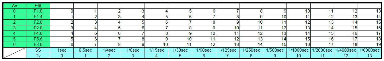 前述のAv値とTv値とEV値の値には、以下の式が成り立ちます。